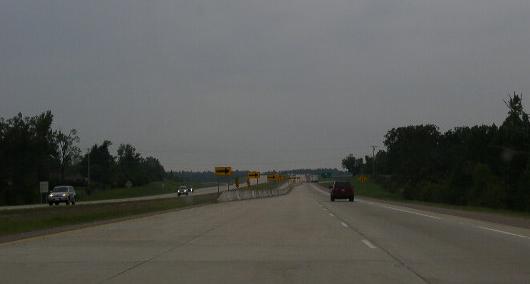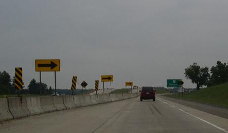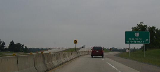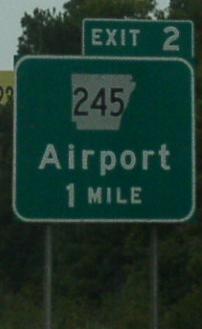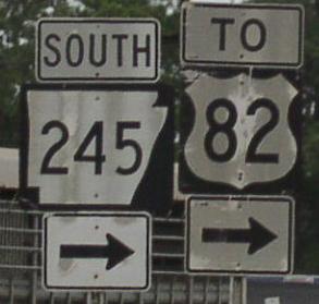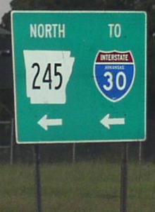 BGS on WB I-30. BGS on EB I-30. A set of guide markers on a ramp from WB I-30. SB AR St Rt 245 near 19th Street in Texarkana. Warning sign that the expressway is ending. SB AR St Rt 245 at the reduction of traffic lanes. All traffic is forced off at U.S. Rt. 71. The highway is closed to traffic south of here. A look at a new stack interchange south of U.S. Rt. 71. (Sept 2003) BGS on SB U.S. Rt. 71.