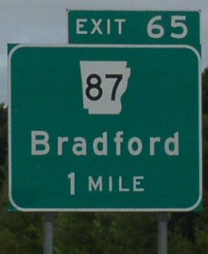 Arkansas State Route 87 runs through White County in two diferent location. The first is along U.S. Rt. 167 near Denmark. Finally there is a section near Bradford. Near Searcy, this highway shows on maps again. AR St Rt 87 passes through the following towns in White County. Denmark Bradford AR St Rt 87 is multi-plexed in White County. U.S. Rt. 167, from the Independence/White County Line to near Denmark. AR St Rt 87 intersects the following highways in White County. U.S. Rt. 167, near Denmark. Arkansas State Route 367, at Bradford. U.S. Rt. 67, near Bradford. Arkansas State Route 36, ner Searcy. Arkansas State Route 11, near Searcy.