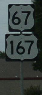 SB U.S. Rt. 67/167 in Northern Pulaski County. This highway is multi-plexed with U.S. Rt. 167 on the expressway northeast of Little Rock. SB U.S. Rt. 67/167 near Jacksonville. SB U.S. Rt. 67/167 near AR St Rt 440. Overhead signs on SB U.S. Rt. 67/167 at AR St Rt 440. The end of EB I-30 at I-40. U.S. Rt. 167 is only listed on a few BGS's in Little Rock. BGS on AR St Rt 10 in Little Rock. Overhead signs on WB I-440 at I-30/530.