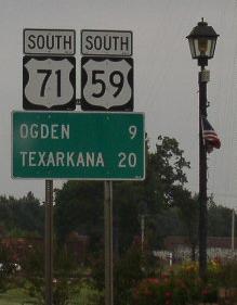 Junction markers on EB AR St Rt 32 in Ashdown. SB U.S. Rt. 59/71; EB AR St Rt 32 at Ashdown. SB U.S. Rt. 59/71 near Ogden. SB U.S. Rt. 59/71 at the Red River. This is also the Arkansas/Texas State Line.