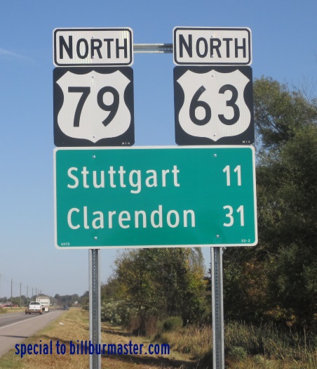 U.S. Federal Route 63 is a north-south highway in Northwestern Arkansas County. It runs from the Jefferson/Arkansas County Line, at Humphrey, to the Prairie/Arkansas County Line, near Fairmount. U.S. Rt. 63 passes through the following towns in Arkansas County. Humphrey Stuttgart U.S. Rt. 63 is multi-plexed in Arkansas County. U.S. Rt. 79, from the Jefferson/Arkansas County Line to Stuttgart.