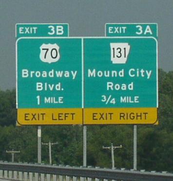 NB I-55/U.S. Rt. 61; WB U.S. Rt. 64-70; SB U.S. Rt. 79 at the Arkansas Welcome sign. SB I-55/U.S. Rt. 61; EB U.S. Rt. 64/70; NB U.S. Rt. 79 crossing the Mississippi River. SB I-55/U.S. Rt. 61; EB U.S. Rt. 64/70 near the Mississippi River. SB I-55/U.S. Rt. 61; EB U.S. Rt. 64/70; NB U.S. Rt. 79 near West Memphis. A BGS on NB I-55/U.S. Rt. 61; WB U.S. Rt. 64-70; SB U.S. Rt. 79.