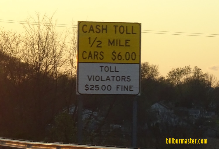 A toll warning sign on SB I-295/WB U.S. Rt. 40. (July, 2019)