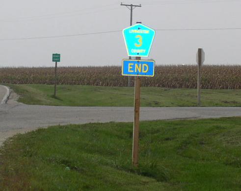 The southern end at the Ford/Livingston County Line. The southern end marker. SB LCH 3 ner LCH 22. SB LCH 3 south of Chatsworth. A junction sign on WB U.S. Rt. 24. Looking north along LCH 3 in Chatsworth from U.S. Rt. 24. NB LCH 3 north of Chatsworth. NB LCH 3 near Charlotte. NB LCH 3 south of IL St Rt 116. A yellow junction sign on WB IL St Rt 116. SB LCH 3 near LCH 12. SB LCH 3 near LCH 12. SB LCH 3 south of LCH 2. SB LCH 3 south of LCH 7. SB LCH 3 in Campus. SB LCH 3 north of Campus. NB LCH 3 near Blair. SB LCH 3 at the Grundy/Livingston County Line. The northern end of LCH 3. (September, 2006) The northern end marker. (September, 2006) The northern end of LCH 3. (February, 2024) The northern end marker at the Livingston/Grundy County Line. (2005)