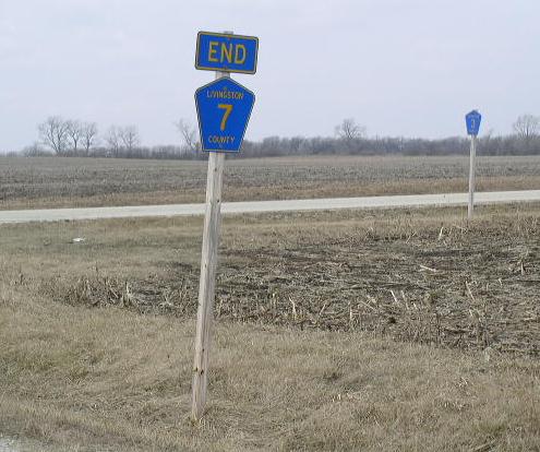The eastern end of LCH 7 at the Ford/Livingston/Kankakee County Line. The eastern end marker. Looking east along LCH 7 near LCH 3. The western end. The western end marker.