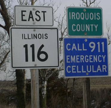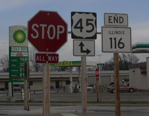 EB IL St Rt 116 at the Iroquois/Ford County Line. EB IL St Rt 116 west of I-57. WB IL St Rt 116 west of I-57. A BGS on NB I-57. A BGS on SB I-57. A BGS on SB I-57. EB IL St Rt 116 east of I-57. A street sign near Ashkum. A junction marker on NB U.S. Rt. 45. The eastern end of IL St Rt 116. The eastern end marker.