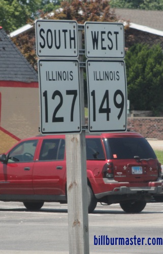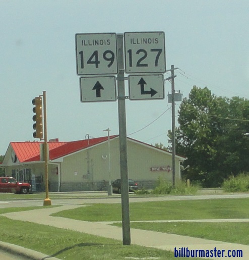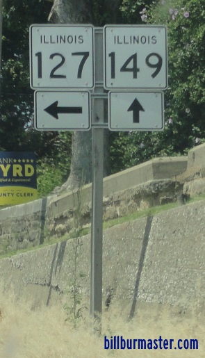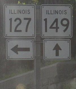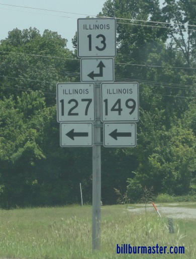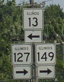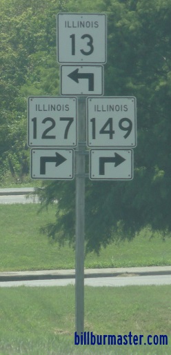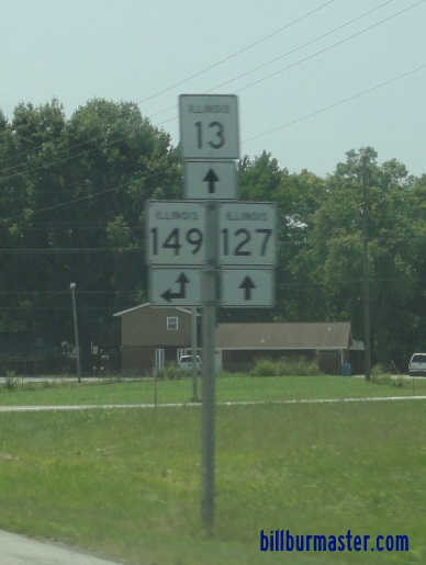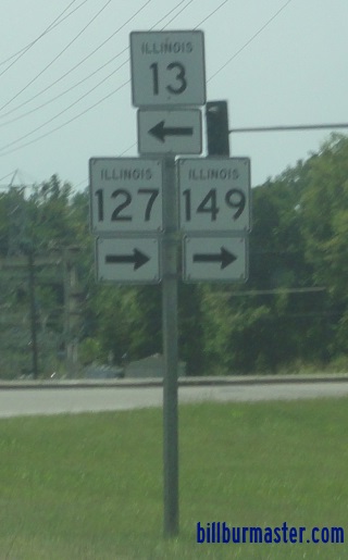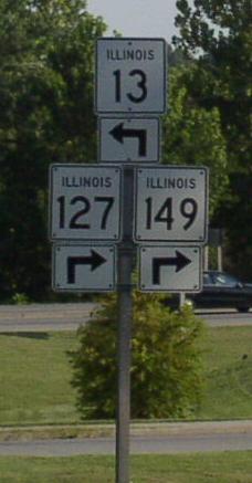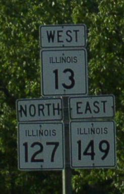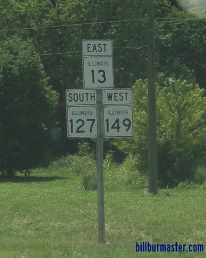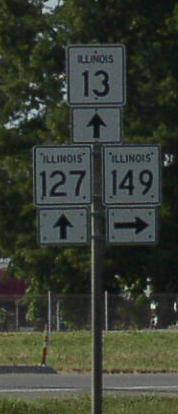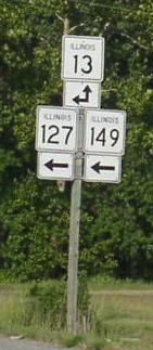 A junction marker on EB IL St Rt 13/SB IL St Rt 127. EB IL St Rt 13/SB IL St Rt 127/WB IL St Rt 149 south of east IL St Rt 149. EB IL St Rt 13/SB IL St Rt 127/WB IL St Rt 149 north of Walnut. EB IL St Rt 13/SB IL St Rt 127/WB IL St Rt 149 in Murphysboro. NB IL St Rt 127/EB IL St Rt 149 west of IL St Rt 13. NB IL St Rt 127/EB IL St Rt 149 east of 5th. EB IL St Rt 149 at south IL St Rt 127. WB IL St Rt 149 west of south IL St Rt 127. WB IL St Rt 149 at 11th Street. WB IL St Rt 149 near Illinois State Route 3. The western end marker.