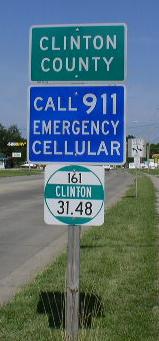 A Clinton County mile marker. WB IL St Rt 161 west of Centralia. EB IL St Rt 161 east of Albers. A junction marker on SB IL St Rt 160. EB IL St Rt 161 in New Baden.