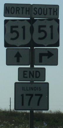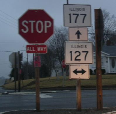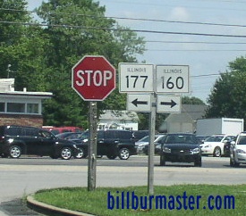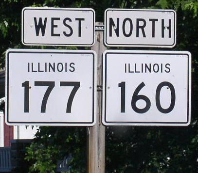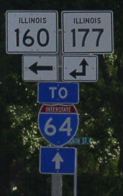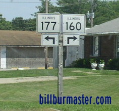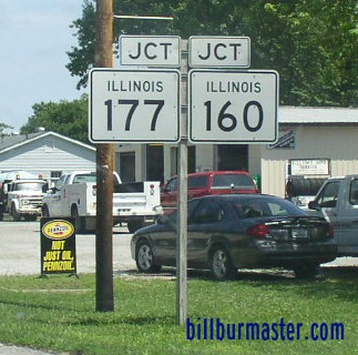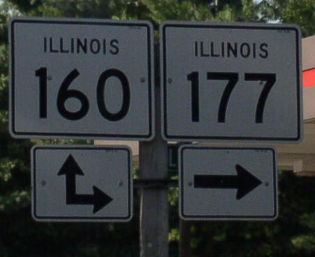 SB IL St Rt 160/EB IL St Rt 177 at the Clinton/Washington County Line. SB IL St Rt 160/EB IL St Rt 177 near Okawville. A junction marker on EB IL St Rt 160/SB IL St Rt 177. WB IL St Rt 177 east of Irvington. WB IL St Rt 177 east of U.S. Rt. 51. A BGS on SB U.S. Rt. 51. The eastern end marker.