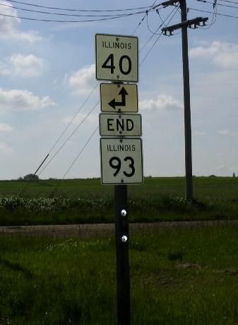 The eastern end of IL St Rt 93 at IL St Rt 40. The eastern end marker. WB IL St Rt 93 west of IL St Rt 40. WB IL St Rt 93 near Osceola. WB IL St Rt 93 east of Elmira. The western end of IL St Rt 93. Western end marker.
