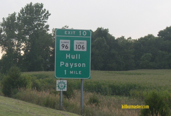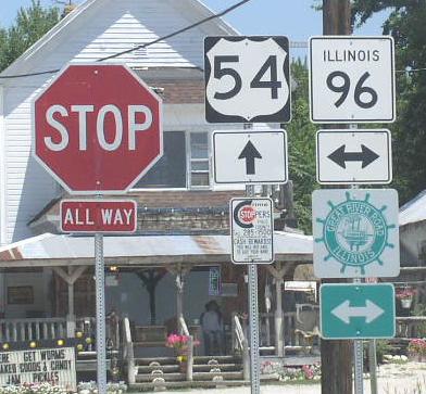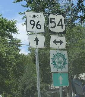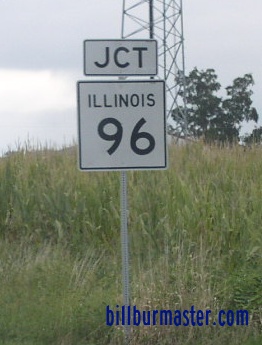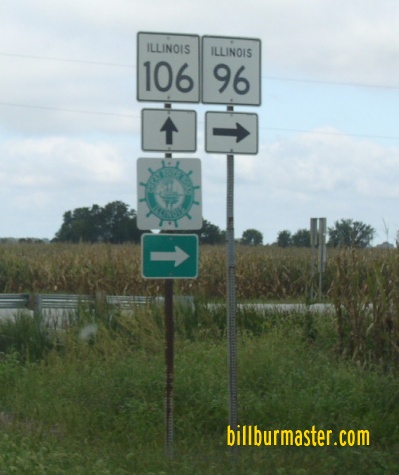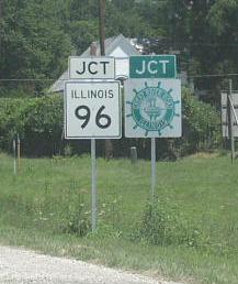 SB IL St Rt 96 south of Pleasant Hill. SB IL St Rt 96 south of Atlas. NB IL St Rt 96 in Atlas. A junction marker on EB U.S. Rt. 54. SB IL St Rt 96 south of Rockport. SB IL St Rt 96 near El Dara. SB IL St Rt 96 south of New Canton. NB IL St Rt 96 south of Kinderhook. NB IL St Rt 96/WB IL St Rt 100 west of Kinderhook. A junction marker on EB IL St Rt 106. NB IL St Rt 96 south of I-72/U.S. Rt. 36. A BGS on WB I-72/U.S. Rt. 36. A BGS on EB I-72/U.S. Rt. 36.