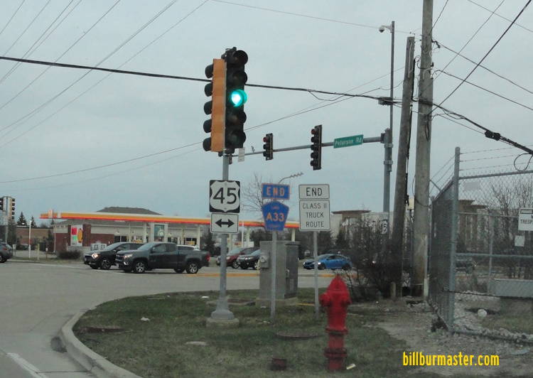 SB U.S. Rt. 45 at the Illinois/Wisconsin State Line. (March, 2024) SB U.S. Rt. 45 at the Illinois Welcome Sign. (March, 2024) A junction marker on EB IL St Rt 137. A guide marker on EB LCH A33. SB U.S. Rt. 45 south of Winchester Road. NB U.S. Rt. 45 near the E, J, & E tracks in Mundelein. SB U.S. Rt. 45 south of IL St Rt 176.