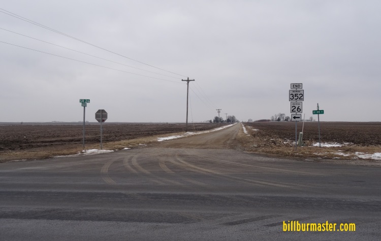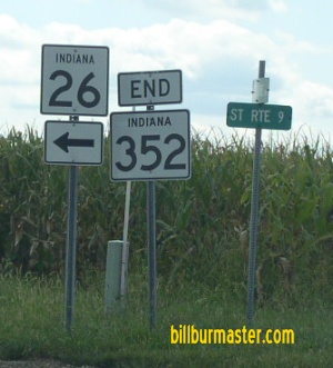 SB IN St Rt 352 south of the Benton/Warren County Line. A junction marker on EB IL St Rt 9. NB IN St Rt 352 at IL St Rt 9/IN St Rt 26. NB IN St Rt 352 at IL St rt 9/IN St Rt 26. (February, 2016) A guide marker on WB IN St Rt 26. SB IN St Rt 352 at the southern end point. The southern end marker. The southern end of IN St Rt 352. (February, 2016) The southern end marker. (February, 2016)