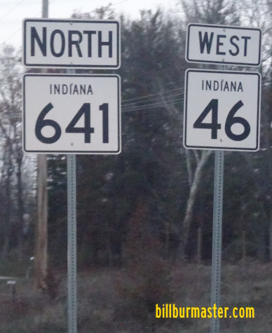 A BGS on NB IN St Rt 641. A BGS on NB IN St Rt 641. EB IN St Rt 46 south of I-70. A BGS on EB I-70. A BGS on EB I-70/U.S. Rt. 40. A BGS on EB I-70/U.S. Rt. 40. A BGS on EB I-70/U.S. Rt. 40. EB U.S. Rt. 40/WB IN St Rt 46/NB IN St Rt 641 at I-70. EB U.S. Rt. 40/WB IN St Rt 46 under I-70. A set of guide markers on EB U.S. Rt 40/WB IN St Rt 46. EB U.S. Rt. 40/WB IN St Rt 46 at IN St Rt 42. A set of guide markers on WB IN St Rt 42. The first western end marker. The western end of IN St Rt 46. A second western end marker. The western end of IN St Rt 46. The western end marker.