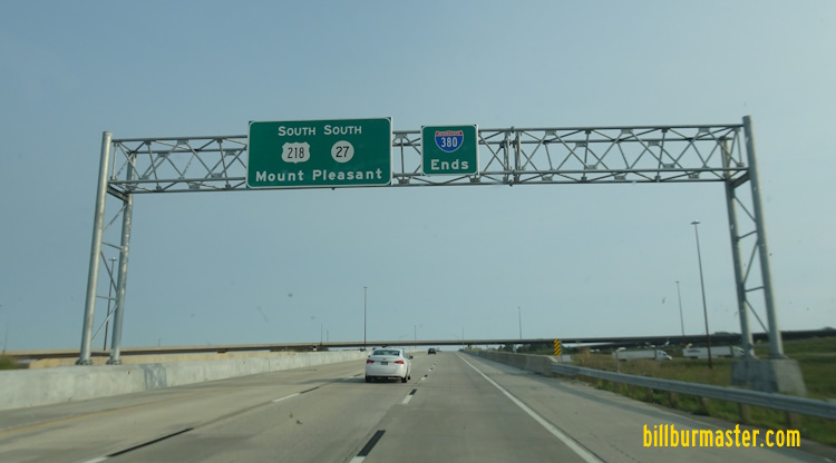 The southern end marker of I-380 at I-80 in Iowa City. U.S. Rt. 218/IA 27 continue on south.
