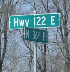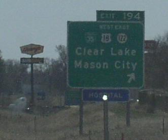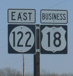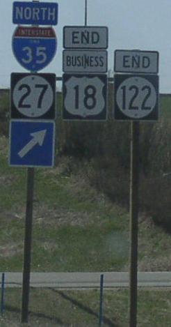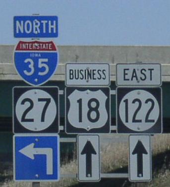 A BGS on SB I-35/IA St Rt 27. A BGS on EB BUSN U.S. Rt. 18/IA St Rt 122 at I-35/U.S. Rt. 18/IA St Rt 27. NOTE: how the IA St Rt 122 shield was place over the U.S. Rt. 18 shield. A street sign in Rural Cerro Gordo County. EB BUSN U.S. Rt. 18/IA St Rt 122 east of I-35. The western end marker near Clear Lake.