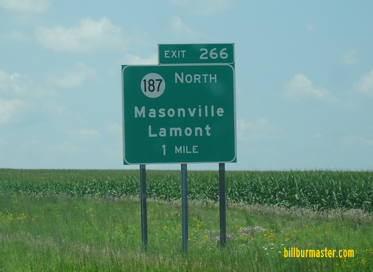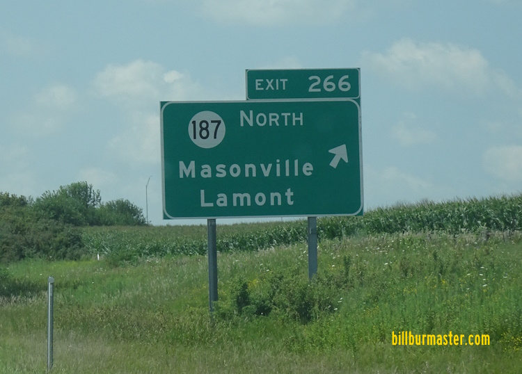 Iowa State Route 187 is a north-south highway in Eastern Buchanan County. It runs from U.S. Rt. 20, near Masonville, to the Buchanan/Fayette County Line, near Maryville. IA St Rt 187 passes through the following town in Buchanan County. Lamont IA St Rt 187 is not multi-plexed in Buchanan County. IA St Rt 187 intersects the following highway in Buchanan County. U.S. Rt. 20, near Masonville.