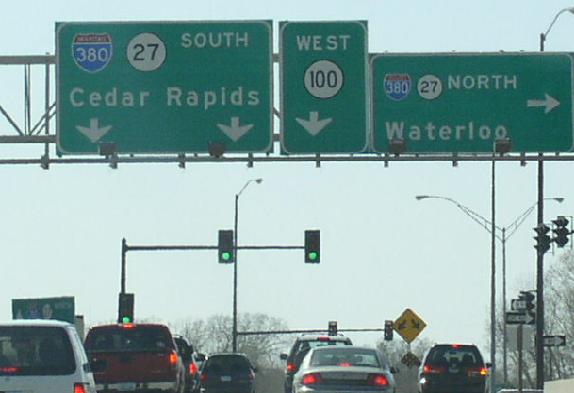 SB I-380/IA St Rt 27 north of Cedar Rapids. SB I-380/IA St Rt 27 at IA St Rt 100. A BGS on WB IA St Rt 100. A BGS on WB IA St Rt 100. A BGS on WB IA St Rt 100. A BGS on WB IA 100 on Cedar Rapids. Ramp to I-380/IA 27 on WB IA 100 in Cedar Rapids. NB I-380/IA St Rt 27 at IA St Rt 100. A BGS on WB IA St Rt 100. A BGS on WB IA St Rt 100. SB I-380/IA St Rt 27 at 32nd. NB I-380/IA St Rt 27 at 29th Street NE. NB I-380/IA St Rt 27 south of 29th Street NE. SB I-380/IA 27 near H Ave in Cedar Rapids. SB I-380/IA St Rt 27 at H Ave. SB I-380/IA St Rt 27 at H Ave. SB I-380/IA 27 at 7th Street in Cedar Rapids. NB I-380/IA St Rt 27 near Cedar Lake. SB I-380/IA St Rt 27 at 8th. NB I-380/IA St Rt 27 at 7th. NB I-380/IA St Rt 27 at 4th. Looking north at the Cedar River bridge for I-380/IA 27 (upper deck) and IA 94 (lower deck) in Downtown Cedar Rapids. Photo taken from the BUSN. U.S. Rt. 151 bridge. NB I-380/IA St Rt 27 at the Cedar River. NB I-380/IA St Rt 27 near Wilson Ave SW. SB I-380/IA St Rt 27 at Wilson. SB I-380/IA St Rt 27 at 27th. NB I-380/IA St Rt 27 near M.P. 17. SB I-380/IA 27 near 33rd Ave. NB I-380/IA St Rt 27 north of U.S. Rt. 30/151/218. A BGS on SB I-380/IA St Rt 27. A BGS on SB I-380/IA St Rt 27. A BGS on SB I-380/IA St Rt 27. SB I-380/IA St Rt 27 at U.S. Rt. 30/151/218. SB I-380/IA St Rt 27 at U.S. Rt. 30/151/218. SB I-380/IA 27 near U.S. Rt. 30/151/218 on the southside of Cedar Rapids. A BGS on EB U.S. 30/N.B. U.S. Rt. 151 at I-380/IA 27 in Cedar Rapids. NB I-380/U.S. Rt. 218/IA St Rt 27 at U.S. Rt. 30/151. NB I-380/U.S. Rt. 218/IA St Rt 27 south of U.S. Rt. 30/151. SB I-380/U.S. Rt. 218/IA St Rt 27 south of U.S. Rt. 30/151. NB I-380/U.S. Rt. 218/IA St Rt 27 near the Cedar Rapids Airport. NB I-380/U.S. Rt. 218/IA St Rt 27 at the Linn/Johnson County Line.