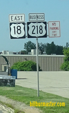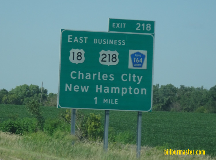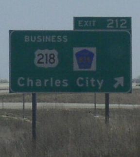 A BGS on NB U.S. Rt. 218/IA St Rt 27. EB U.S. Rt. 18/NB BUSN U.S. Rt. 218 north of south U.S. Rt. 218/IA St Rt 27. EB U.S. Rt. 18/NB BUSN U.S. Rt. 218 at IA St Rt 14. NB BUSN U.S. Rt. 218/SB IA St Rt 14 at Cedar. SB BUSN U.S. Rt. 218 at south IA St Rt 14. NB BUSN U.S. Rt. 218 north of Charles City. A guide marker on EB U.S. Rt. 18; SB U.S. Rt. 218/IA St Rt 27. A BGS on EB U.S. Rt. 18; SB U.S. Rt. 218/IA St Rt 27. The northern end of BUSN U.S. Rt. 218.