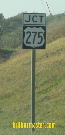 A junction marker on WB IA St Rt 2. A junction marker in Sidney. NB U.S. Rt. 275 north of Sidney. NB U.S. Rt. 275 near Anderson. NB U.S. Rt. 275 south of Tabor. NB U.S. Rt. 275 in Tabor. NB U.S. Rt. 275 south of the Fremont/Mills County Line.
