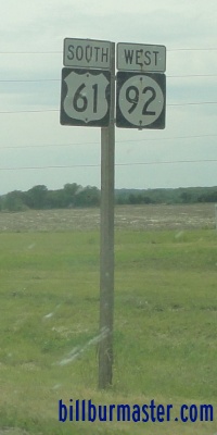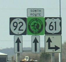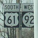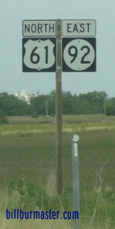 Branches of U.S. Rt. 61 in Muscatine County. NB U.S. Rt. 61/EB IA St Rt 92 on the southside of Muscatine. SB U.S. Rt. 61 south of IA St Rt 22. NB U.S. Rt. 61 on the westside of Muscatine. NB U.S. Rt. 61/EB IA St Rt 22 on the northwest side of Muscatine. NB U.S. Rt. 61/EB IA St Rt 22 on the northside of Muscatine. NB U.S. Rt. 61 north of Muscatine. NB U.S. Rt. 61 near Fairport. NB U.S. Rt. 61 near Blue Grass.