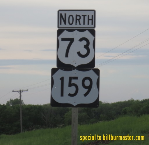 U.S. Federal Route 159 is a north-south highway in Brown County. It runs from the Kansas/Nebraska State Line, near Reserve, to the Brown/Atchison County Line, near Horton. U.S. Rt. 159 passes through the following towns in Brown County. Reserve Hiawatha Horton U.S. Rt. 159 is multi-plexed in Brown County. U.S. Rt. 73, from the Kansas/Nebraska State Line, to Horton.