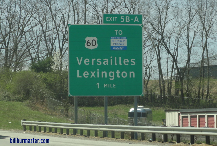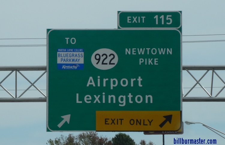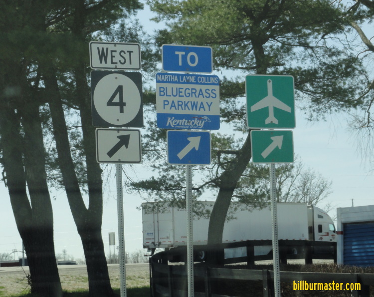 A BGS on EB I-64/SB I-75. A BGS on EB I-64/SB I-75. A BGS on EB I-64/SB I-75. A BGS on EB I-64/SB I-75. A BGS on WB I-64/NB I-75. A BGS on SB KY St Rt 922. A guide marker on SB KY St Rt 922. A BGS on WB KY St Rt 4. A BGS on WB KY St Rt 4. A junction marker on SB KY St Rt 52. WB Bluegrass near Younger Creek. A mileage chart on NB I-65.