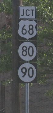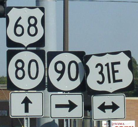 A junction makrer on NB BUSN U.S. Rt. 31E. WB U.S. Rt. 68/KY St Rt 80; NB KY St Rt 90 north of Downtown Glasgow.