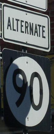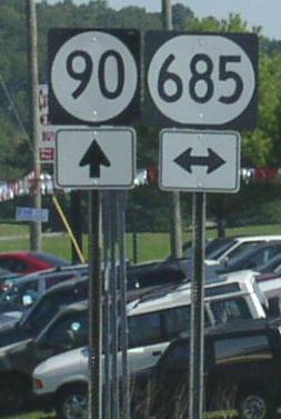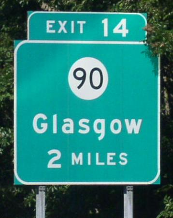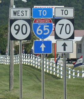 Branches of KY St Rt 90 in Barren County. A BGS on WB Cumberland Pkwy. A junction marker on NB BUSN U.S. Rt. 31E. WB U.S. Rt. 68/KY St Rt 80; NB KY St Rt 90 north of Downtown Glasgow. NB KY St Rt 90 north of Glasgow. A guide marker on Cave City.