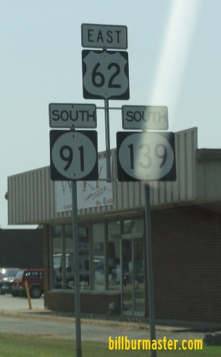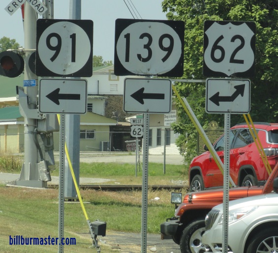 Branches of U.S. Rt. 62 in Caldwell County. A junction marker on SB KY St Rt 91/139. EB U.S. Rt. 62; SB KY St Rt 91/139 south of Seminary in Princeton. EB U.S. Rt. 62; SB KY St Rt 91; NB KY St Rt 139/239 on the southeast side of the courthouse square in Princeton. A guide marker on EB U.S. Rt. 62; NB KY St Rt 91/139/239. EB U.S> Rt. 62/NB KY St Rt 293 east of the courthouse square in Princeton. EB U.S. Rt. 62/NB KY St Rt 293 at north KY St Rt 293.