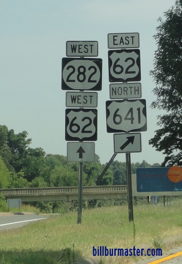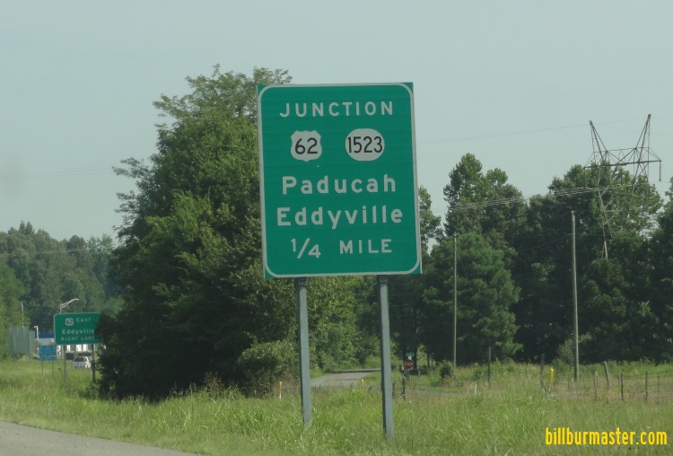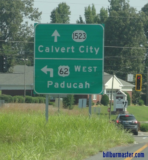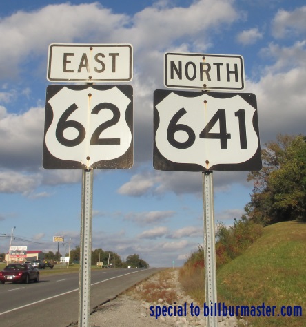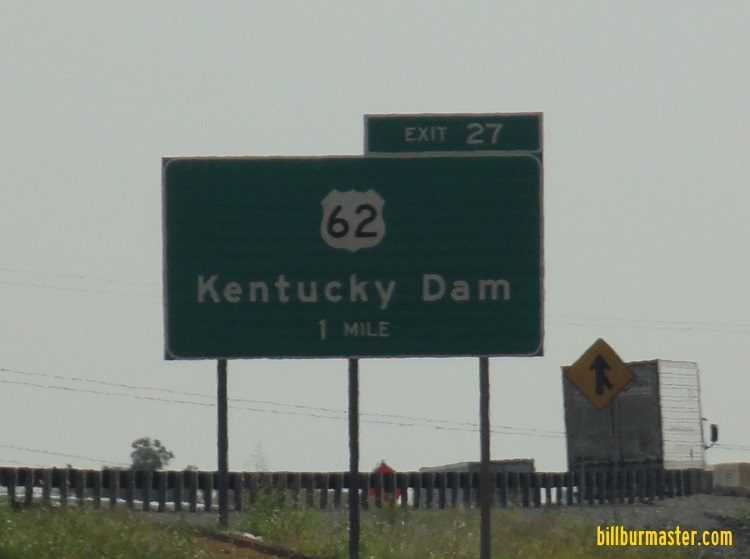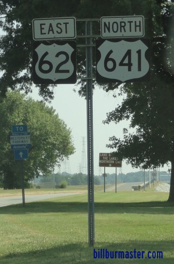 A junction marker on SB KY St Rt 95. A guide marker on SB KY St Rt 95. EB U.S. Rt. 62 east of KY St Rt 1523. A BGS on NB I-69. A BGS on NB I-69. A BGS on NB I-69. A BGS on EB I-24. A BGS on EB I-24. A junction marker on NB JMC Purchase Parkway. A junction marker on NB JMC Purchase Parkway. A BGS on NB JMC Purchase Parkway. A BGS on EB I-24. EB U.S. Rt. 62 at I-62/69. A junction marker on NB U.S. Rt. 641. EB U.S. Rt. 62/NB U.S. Rt. 641 east of KY St Rt 282. EB U.S. Rt. 62/NB U.S. Rt. 641 at Kentucky Lake/Kentucky Dam.