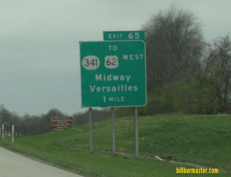 U.S. Federal Route 62 runs north-south highway in Central Woodford County. It runs from the Anderson/Woodford County Line, east of Lawrenceburg, to the Scott/Woodford County Line, near Midway. U.S. Rt. 62 passes through the following towns in Woodford County. Milner Versailles Midway U.S. Rt. 62 is multi-plexed in Woodford County. Kentucky Secondary State Route 1964, at Versailles. BUSN U.S. Rt. 60, at Versailles. U.S. Rt. 60, at Versailles. U.S. Rt. 62 intersects the following highways in Woodford County. Kentucky Secondary State Route 1685, at Milner. Kentucky Secondary State Route 2113, at Versailles. Kentucky Secondary State Route 1964, at Versailles. Kentucky Secondary State Route 1964, at Versailles. Kentucky State Route 33, at Versailles. BUSN U.S. Rt. 60, at Versailles. Kentucky Secondary State Route 1659, at Versailles. U.S. Rt. 60, at Versailles. BUSN U.S. Rt. 60, at Versailles. U.S. Rt. 60, at Versailles. Kentucky Secondary State Route 1681, near Midway. U.S. Rt. 421, from Midway to the Woodford/Fayette County Line. Kentucky State Route 341, at Midway.