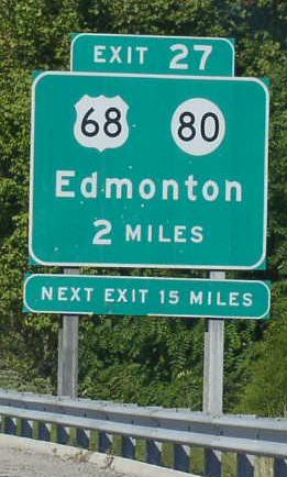 U.S. Federal Route 68 is one of the main highways in Northern Metcalfe County. It runs east-west from the Barren/Metcalfe County Line to Edmonton. From Edmonton to the Metcalfe/Green County Line it is a north-south highway. U.S. Rt. 68 passes thorugh the following town in Matcalfe County. Wisdom Cave Ridge Edmonton U.S. Rt. 68 is multi-plexed in Metcalfe County. Kentucky State Route 80, from the Barren/Metcalfe County Line to Edmonton. Kentucky State Route 70, from near Sulphur Well to the Metcalfe/Green County. U.S. Rt. 68 crosses the following highways in highways in Metcalfe County. Kentucky State Route 640, near Wisdom. Louie B. Nunn Cumberland Parkway, near Wisdom. Kentucky Secondary State Route 3234, near Cave Ridge. Kentucky State Route 861, near Edmonton. Kentucky State Route 163, at Edmonton. Kentucky State Route 533, at Edmonton. Kentucky State Route 80, at Edmondton. Louie B. Nunn Cumberland Parkway, near Edmondton. (NO INTERCHANGE) Kentucky Secondary State Route 1243, near Edmonton. Kentucky Secondary State Route 2399, near Edmonton. Kentucky State Route 544, near Cork. Kentucky State Route 543, near Cork. Kentucky State Route 70, near Sulphur Well. Kentucky State Route 745, near Sulphur Well.