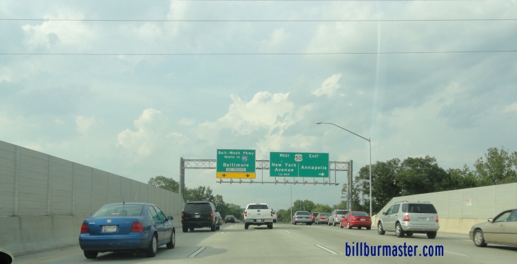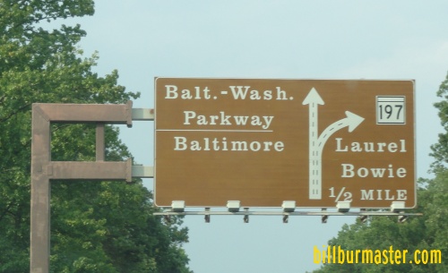 NB B-W Pkwy at U.S. Rt. 50. A NB guide marker. A set of guide signs on EB U.S. Rt. 50. NB B-W Pkwy near Landover Hills. NB B-W Pkwy near MD St Rt 193. A BGS in Greenbelt. A guide sign on NB B-W Pkwy. NB B-W Pkwy near MD St Rt 198. NB B-W Pkwy at I-195, near BWI Airport. NB B-W Pkwy at the Anne Arundel/Baltimore County Line. NB B-W Pkwy near Waterview Ave in Baltimore.