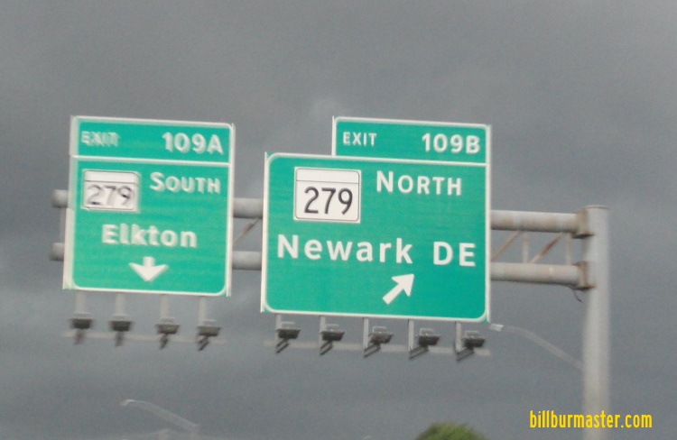 SB MD St Rt 279 at the Delaware/Maryland State Line. A BGS on SB I-95. A BGS on SB I-95. A BGS on NB I-95. A guide marker in Elkton. A guide marker on SB MD St Rt 279.