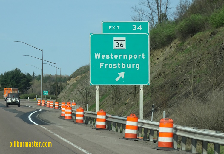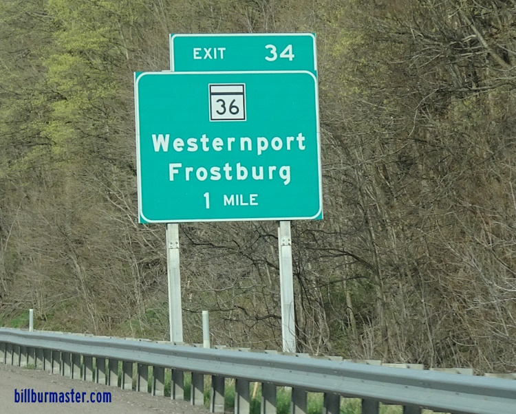 Maryland State Route 36 runs north-south in Western Allegany County. It goes rom the West Virginia/Maryland State Line, near Westernport, to Cumberland. MD St Rt 36 passes through the following towns in Allegany County. Westernport Barton Moscow Pekin Lonaconing Midland Frostburg Zihlman Mt. Savage Barrellville Corriganville Cumberland MD St Rt 36 is multi-plexed in Allegany County. ALT U.S. Rt. 40, near Frostburg. MD St Rt 36 intersects the following highways in Allegany County. Maryland State Route 135, at Westernport. Maryland State Route 937, near Westernport. Maryland State Route 935, near Barton. Maryland Staet Route 935, near Lonaconing. Maryland State Route 657, at Lonaconing. Maryland State Route 936, near Midland. Maryland State Route 55, near Vale Summit. Interstate 68, near Frostburg. U.S. Rt. 40, near Frostburg. ALT U.S. Rt. 40, near Frostburg. Maryland State Route 936, at Frostburg. ALT U.S. Rt. 40, at Frostburg. Maryland State Route 638, near Mt. Savage. Maryland State Route 47, at Barrellville. Maryland State Route 831, near Corriganville. Maryland State Route 35, near Corriganville. Maryland State Route 831, near Corriganville. Maryland State Route 831, near Cumberland. ALT U.S. Rt. 40, at Cumberland.