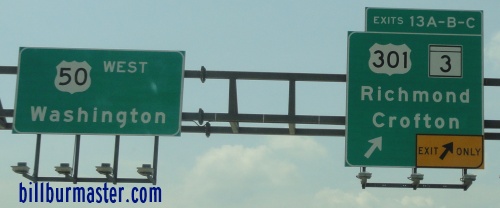 U.S. Federal Route 50 is an east-west highway in highway in Prince George's County. It runs from the Anne Arundel/Prince George's County Line, near Bowie, to the Washington D.C. line. U.S. Rt. 50 passes through the following town in Prince George's County. Bowie U.S. Rt. 50 is multi-plexed in Prince George's County. Interstate 595, from the Anne Arundel County Line to the Capital Beltway, near Seat Pleasant. U.S. Rt. 301, from the Anne/Arundel County Line to Bowie. U.S. Rt. 50 crosses the following highways in Prince George's County. U.S. Rt. 301, at Bowie.