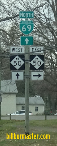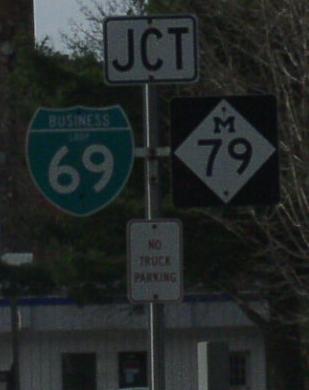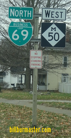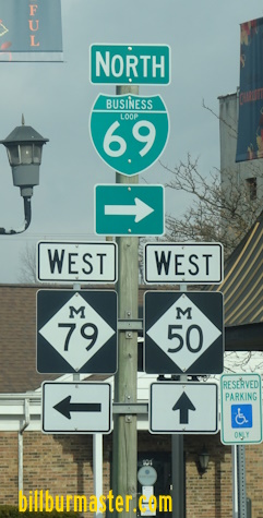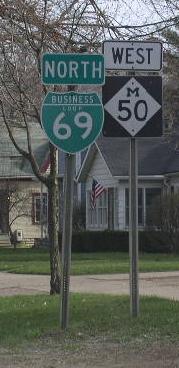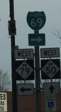 A BGS on NB I-69. A BGS on NB I-69. A guide marker on the ramp from NB I-69. NB BUSN Loop I-69 north of I-69. NB BUSN Loop I-69 south of east MI St Rt 50. NB BUSN Loop I-69 at east MI St Rt 50. A junction marker on WB MI St Rt 50. A junction marker on EB MI St Rt 50. NB BUSN Loop I-69/WB MI St Rt 50 south of MI St Rt 79. A BGS on SB I-69.