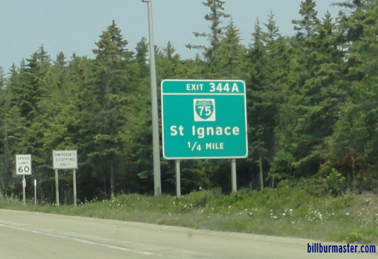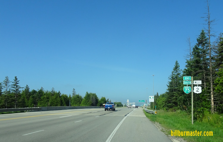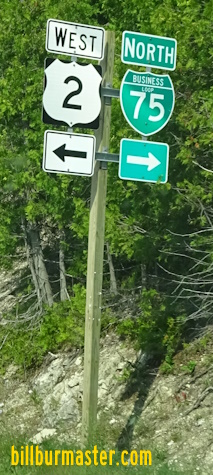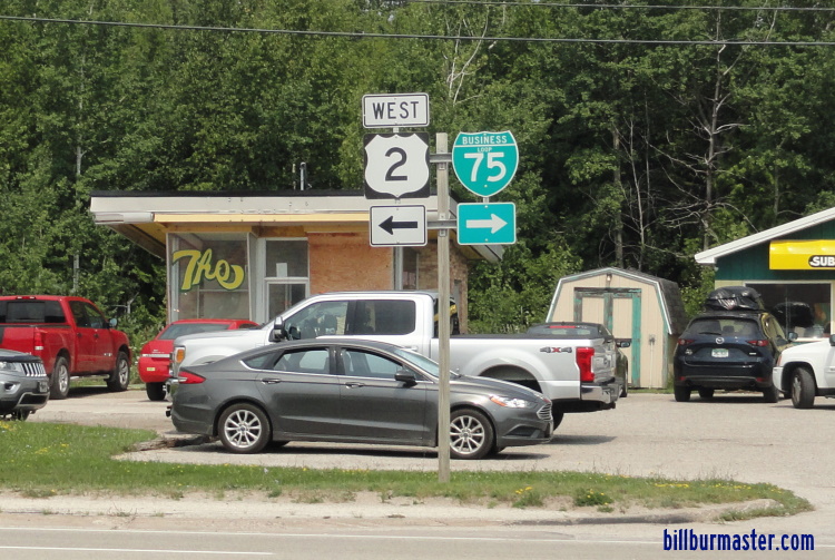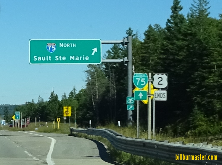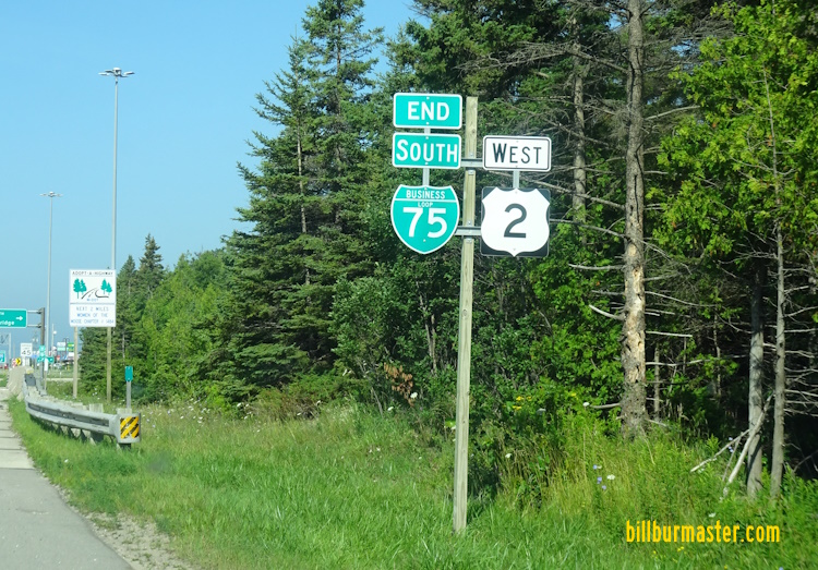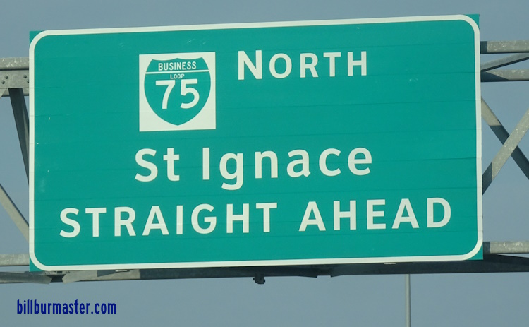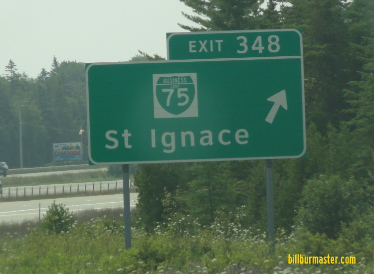 A guide marker on EB U.S. Rt. 2. The southern end of BUSN Loop I-75 in St. Igance. (August, 2021) The southern end marker. (August, 2021) The southern end of BUSN Loop I-75 in St. Ignace. (July, 2025). The southern end marker for BUSN Loop I-75 in St. Ignace. (July, 2025). A BGS on NB I-75. A BGS on NB I-75. A BGS on NB I-75. A BGS on NB I-75. NB BUSN Loop I-75 north of I-75/U.S. Rt. 2. NB BUSN Loop I-75 at Burdette Street in St. Ignace. NB BUSN Loop I-75 at State Street. NB BUSN Loop I-75 at Goudreau Avenue in St. Ignace. NB BUSN Loop I-75 at Glashaw Street in St. Ignace. NB BUSN Loop I-75 near Stockbridge Street in St. Ignace. NB BUSN Loop I-75 near Grodin Road in St. Ignace. A BGS on SB I-75. A BGS on SB I-75.