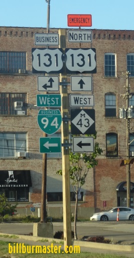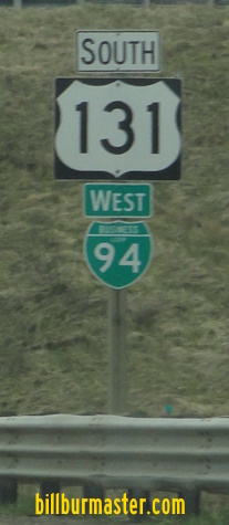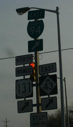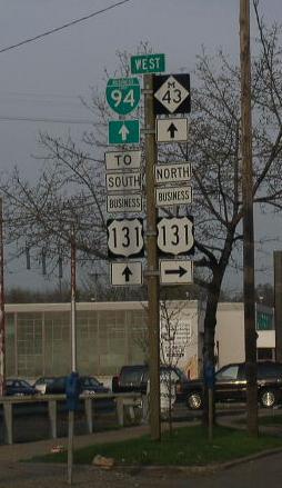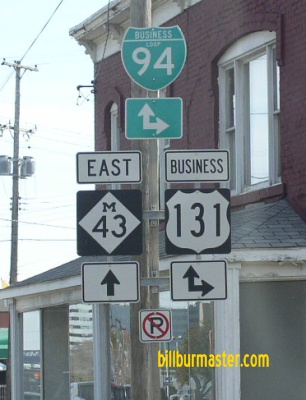 A BGS on WB I-94. A BGS on WB I-94. A BGS on WB I-94. A junction marker on EB MI St Rt 43. A junction marker in Kalamazoo. EB BUSN Loop I-94/MI St Rt 43; NB BUSN U.S. Rt. 131 in Downtown Kalamazoo. A BGS in Downtown Kalamazoo. WB BUSN Loop I-94/SB BUSN U.S. Rt. 131 in Western Kalamazoo. A BGS on EB BUSN Loop I-94/NB U.S. Rt. 131. A BGS on SB U.S. Rt. 131. A BGS on SB U.S. Rt. 131. A BGS on BUSN Loop I-94/U.S. Rt. 131. EB BUSN Loop I-94/NB U.S. Rt. 131 north of I-94. A BGS on EB I-94. A BGS on EB I-94.