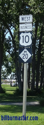 WB MI St Rt 20 west of west BUSN U.S. Rt. 10. A junction marker on EB BUSN U.S. Rt. 10. A guide marker on EB BUSN U.S. Rt. 10. A guide sign in Midland. EB BUSN U.S. Rt. 10/MI St Rt 20 west of east U.S. Rt. 10. A BGS on WB U.S. Rt. 10.