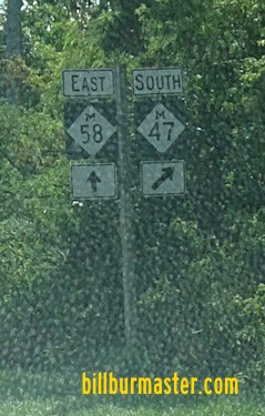 A junction marker on SB MI St Rt 47. EB MI St Rt 58 east of MI St Rt 47. EB MI St Rt 58 near Mitchell Street. EB MI St Rt 58 near Marlou Court. EB MI St Rt 58 at Hemmeter Road. A BGS on NB I-675.