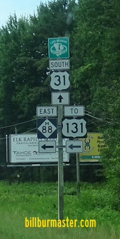 A guide marker on SB U.S. Rt. 31. A guide marker on EB MI St Rt 88. NB U.S. Rt. 131/MI St Rt 66 north of MI St Rt 88. NB U.S Rt. 131/MI St Rt 66 near Valley Road. NB U.S. Rt. 131/MI St Rt 66 north of north MI St Rt 66. NB U.S. Rt. 131 south of Alba. NB U.S. Rt. 131 north of Alba. NB U.S. Rt. 131 at the 45th Parallel. NB U.S. Rt. 131 south of east MI St Rt 32. NB U.S. Rt. 131 at east MI St Rt 32. NB U.S. Rt. 131/WB MI St Rt 32 northeast of Elmira. NB U.S. Rt. 131/WB MI St Rt 32 at west MI St Rt 32. NB U.S. Rt. 131 north of west MI St Rt 32. NB U.S. Rt. 131 near Puroll Road. NB U.S. Rt. 131 near the south branch of the Boyne River. SSB U.S. Rt. 131 at the Antrim/Charlevoix County Line.