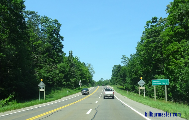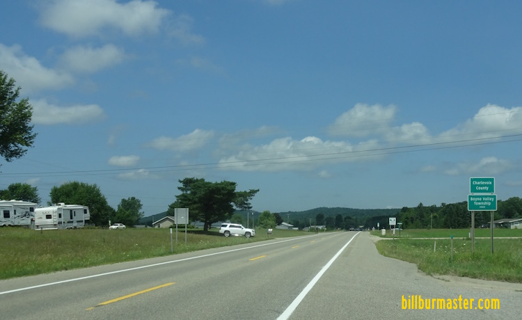 NB U.S. Rt. 131 at the Antrim/Charlevoix County Line. NB U.S. Rt. 131 south of Boyne Falls. NB U.S. Rt. 131 south of MI St Rt 75 in Boyne Falls. NB U.S. Rt. 131 at MI St Rt 75 in Boyne Falls. A guide marker on NB MI St Rt 75. NB U.S. Rt. 131 north of MI St Rt 75, near Wallon Lake. NB U.S. Rt. 131 near Bear River Road. SB U.S. Rt. 131 at the Charlevoix/Emmet County Line.