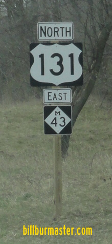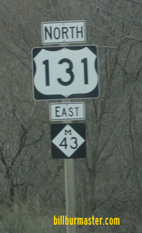 Branches of U.S. Rt. 131 in Kalamazoo County. SB U.S. Rt. 131/WB MI St Rt 43 at the Allegan/Kalamazoo County Line. SB U.S. Rt. 131 south of the Allegan/Kalamazoo County Line. A BGS on D Ave. NB U.S. Rt. 131/EB MI St Rt 43 north of BUSN U.S. Rt. 131. A BGS on SB U.S. Rt. 131. A BGS on SB U.S. Rt. 131/WB MI St Rt 43. A BGS on SB U.S. Rt. 131/WB MI St Rt 43. A BGS on SB U.S. Rt. 131/WB MI St Rt 43. A BGS on SB U.S. Rt. 131/WB MI St Rt 43. A BGS on SB U.S. Rt. 131/WB MI St Rt 43. NB U.S. Rt. 131/EB MI St Rt 43 at BUSN U.S. Rt. 131. SB U.S. Rt. 131 near BUSN U.S. Rt. 131, northwest of Kalamazoo. SB U.S. Rt. 131 at BUSN U.S. Rt. 131, northwest of Kalamazoo. SB U.S. Rt. 131 south of BUSN U.S. Rt. 131. NB U.S. Rt. 131/EB MI St Rt 43 north of west MI St Rt 43. SB U.S. Rt. 131 north of MI St Rt 43. A junction marker on WB Main Street in Kalamazoo. A BGS on WB MI St Rt 43. A BGS on WB MI St Rt 43. SB U.S. Rt. 131 at MI St Rt 43. SB U.S. Rt. 131 south of MI St Rt 43. NB U.S. Rt. 131 at MI St Rt 43. NB U.S. Rt. 131 at BUSN Loop I-94/BUSN U.S. Rt. 131. SB U.S. Rt. 131 north of BUSN Loop I-94/BUSN U.S. Rt. 131. A junction marker on EB BUSN Loop I-94/SB BUSN U.S. Rt. 131. A BGS on Stadium Drive. A BGS on EB Stadium Drive. EB BUSN Loop I-94/NB U.S. Rt. 131 north of I-94. BGS on WB I-94. A BGS on WB I-94. A BGS on WB I-94. A BGS on WB I-94. A BGS on WB I-94. A BGS on EB I-94. A BGS on EB I-94. SB U.S. Rt. 131 at I-94. SB U.S. Rt. 131 at I-94. A BGS on SB U.S. Rt. 131. A BGS on SB U.S. Rt. 131. A BGS on SB U.S. Rt. 131. A BGS on SB U.S. Rt. 131. A BGS on SB U.S. Rt. 131. NB U.S. Rt. 131 at WB I-94. NB U.S. Rt. 131 at EB I-94. NB U.S. Rt. 131 at I-94. NB U.S. Rt. 131 at I-94. SB U.S. Rt. 131 south of I-94. NB U.S. Rt. 131 at Centre Ave. NB U.S. Rt. 131 at the Portage Rest Area. NB U.S. Rt. 131 at the Portage Rest Area. SB U.S. Rt. 131 south of Portage. SB U.S. Rt. 131 north of U Ave. SB U.S. Rt. 131 north of U Ave. SB U.S. Rt. 131 north of U Ave. NB U.S. Rt. 131 north of U Ave. A guide marker on NB U.S. Rt. 131. NB U.S. Rt. 131 at U Ave. SB U.S. Rt. 131 north of Lyon Steet in Schoolcraft. NB U.S. Rt. 131 north of Schoolcraft. NB U.S. Rt. 131 in Schoolcraft. NB U.S. Rt. 131 south of Schoolcraft. SB U.S. Rt. 131 south of Schoolcraft. SB U.S. Rt. 131 south of Schoolcraft. NB U.S. Rt. 131 at the Kalamazoo/St. Joseph County Line.