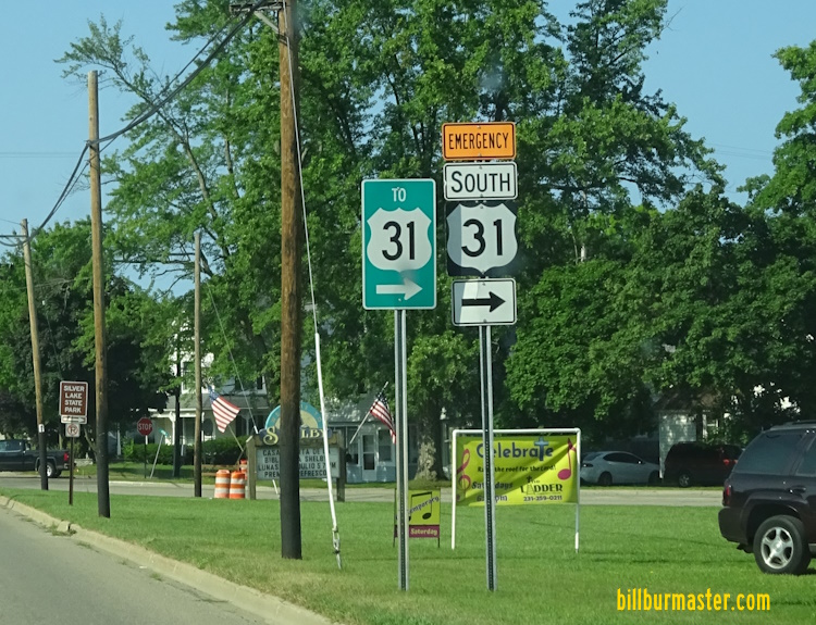 Branches of U.S. Rt. 31 in Oceana County. NB U.S. Rt. 31 at the Muskegon/Oceana County Line. NB U.S. Rt. 31 south a Park Road. NB U.S. Rt. 31 south of MI St Rt 20. NB U.S. Rt. 31 at MI St Rt 20. A guide marker on NB Oceana Drive. A guide marker in Shelby. NB U.S. Rt. 31 north of Shelby. NB U.S. Rt. 31 near the Hart Rest Area. NB U.S. Rt. 31 near Mears. SB U.S. Rt. 31 south of BUSN U.S. Rt. 31 near Hart. A BGS on SB BUSN U.S. Rt. 31, near Hart. A guide marker on NB Oceana Dr. near Pentwater. A junction marker on NB BUSN U.S Rt. 31. A guide marker on NB BUSN U.S. Rt. 31.