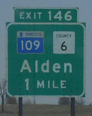 Minnesota State Route 109 is a east-west highway in West-Central Freeborn County. This runs from Interstate 90, near Alden to the Freeborn/Faribault County Line. MN St Rt 109 passes through the following town in Freeborn County. Alden MN St Rt 109 is not multi-plexed in Freeborn County. MN St Rt 109 intersects the following highways in Freeborn County. Interstate 90, near Alden.