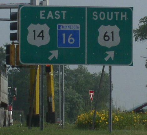 WB U.S. Rt. 14/MN St Rt 16; NB U.S. Rt. 61 near La Crescent. A junction marker on EB MN St Rt 16. A junction marker on EB MN St Rt 16. A BGS on EB MN St Rt 16. A BGS on EB MN St Rt 16. WB U.S. Rt. 14/NB U.S. Rt. 61 in La Crescent.