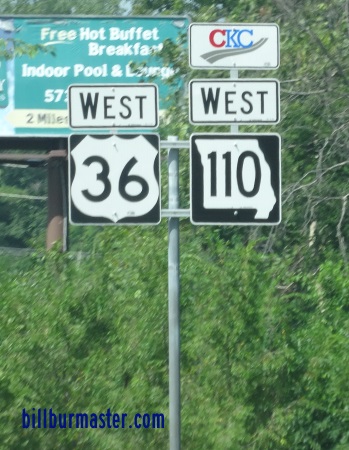 WB I-72/U.S. Rt. 36/MO St Rt 110 at the Missouri Welcome Sign. Photo from: Paul Dienhart EB I-72/U.S. Rt. 36/MO St Rt 79 east of MO St Rt 79. A guide marker on NB MO St Rt 79. A BGS on NB MO St Rt 79. A junction marker on NB MO St Rt 79. A BGS on NB MO St Rt 79. WB I-72/U.S. Rt. 36/MO St Rt 110 west of MO St Rt 79. A BGS on NB U.S. Rt. 61. A junction marker on NB U.S. Rt. 61. A BGS in Hannibal.