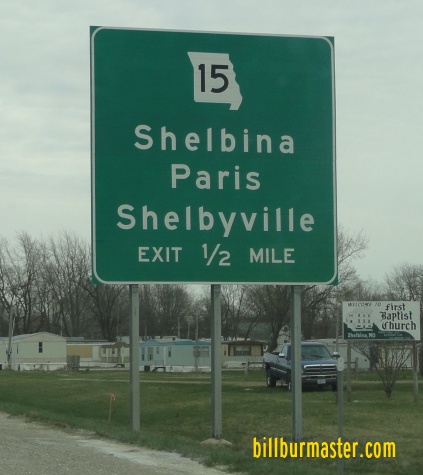 Missouri Seocndary State Route HH, near Shelbina. Missouri Secondary State Route U, near Shelbyville. Missouri Secondary State Route AA, near Shelbyville. Missouri State Route 168, at Shelbyville. Missouri Secondary State Route K, at Shelbyville. Missouri Seocndary State Route P, near Bethel. Missouri Secondary State Route M, near Bethel. Missouri Secondary State Route J, near Bethel. Missouri Seocndary State Route E, near Bethel.